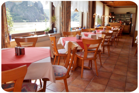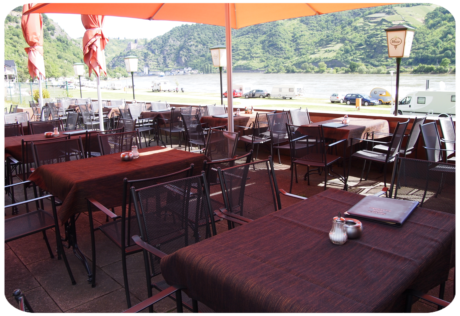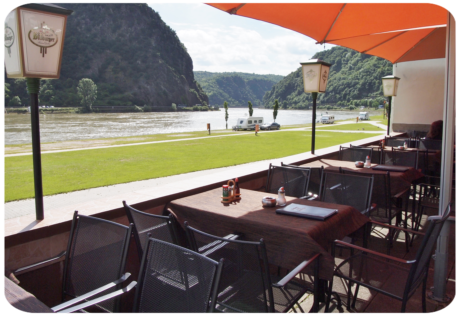 Unsere große Rheinterrasse mit hervorragendem Blick auf Loreley und Rhein bietet Platz für 100 Gäste, die bei schönem Wetter Speisen, Kaffee und Kuchen im Freien genießen möchten.